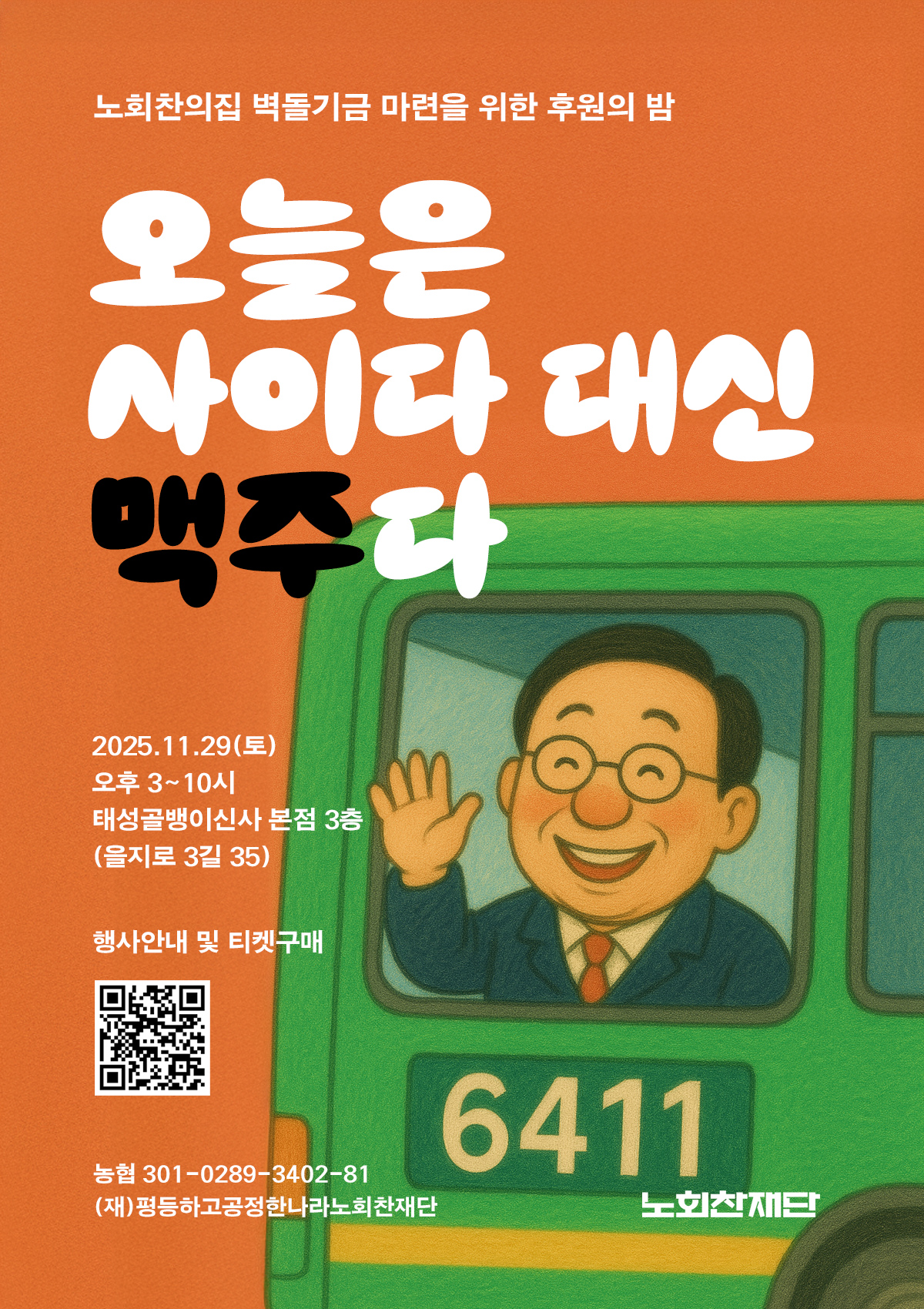 노회찬재단은 오는 12월 <노회찬의집> 준공을 앞두고 부족한 공사비 마련을 위한 즐거운 만남의 광장을 준비했어요. 만명이 아니라 만인이 평등한 나라를 꿈 꾸는 공간 노회찬의집 벽돌기금 마련을 위한 후원의밤에 함께 해주세요!