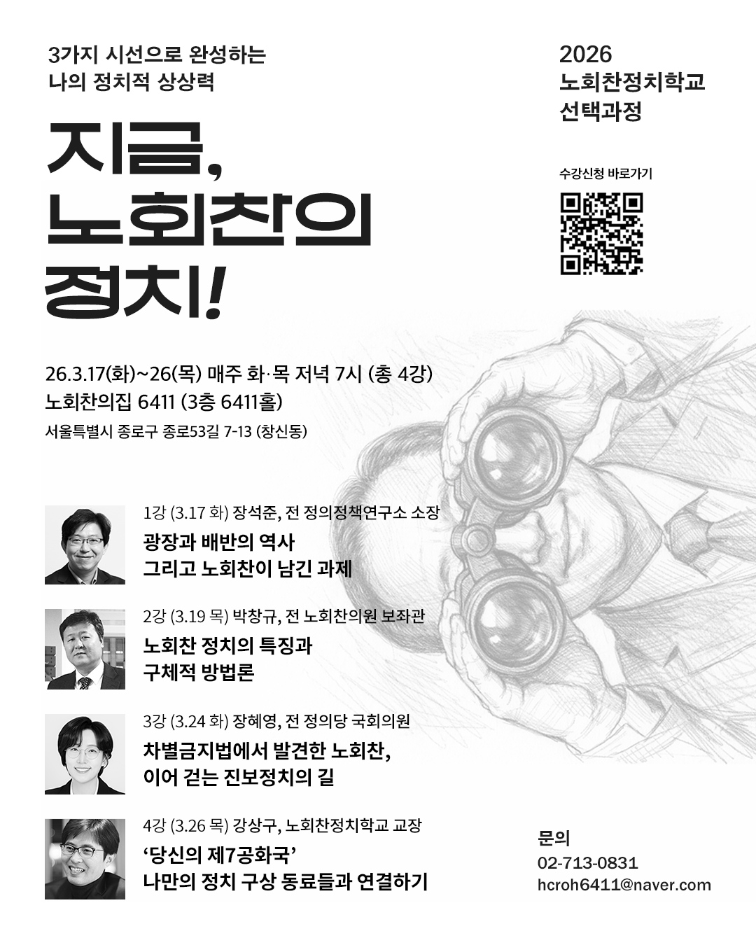 이번 강좌는 노회찬이라는 ‘렌즈’를 통해 한국 정치의 모순을 진단하고, 2026년의 해법을 찾는 시간입니다. 앞으로를 살아갈 우리에게 노회찬의 정치는 지금 새로운 길을 제시합니다.