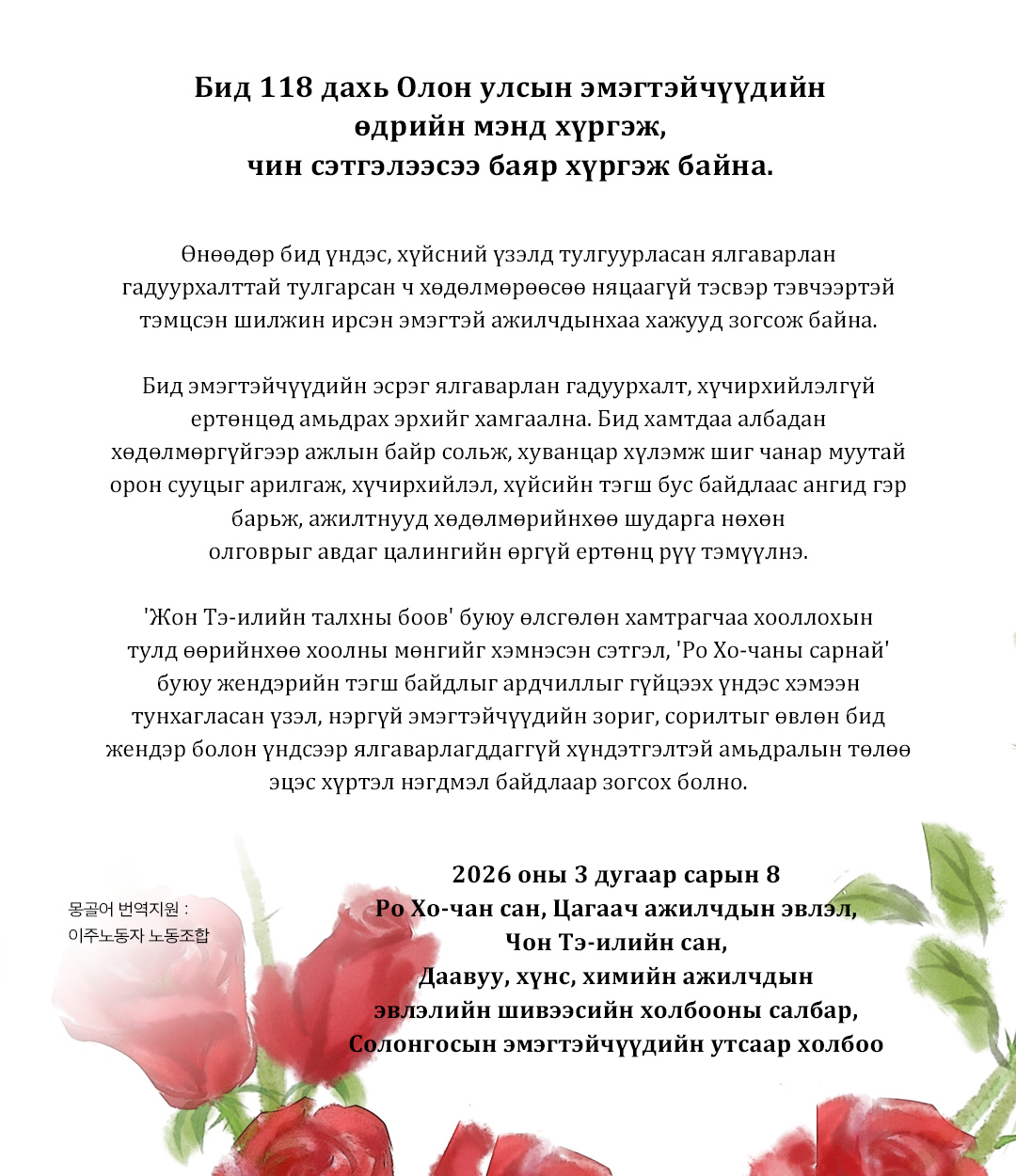제118회 세계 여성의 날을 진심으로 축하합니다.